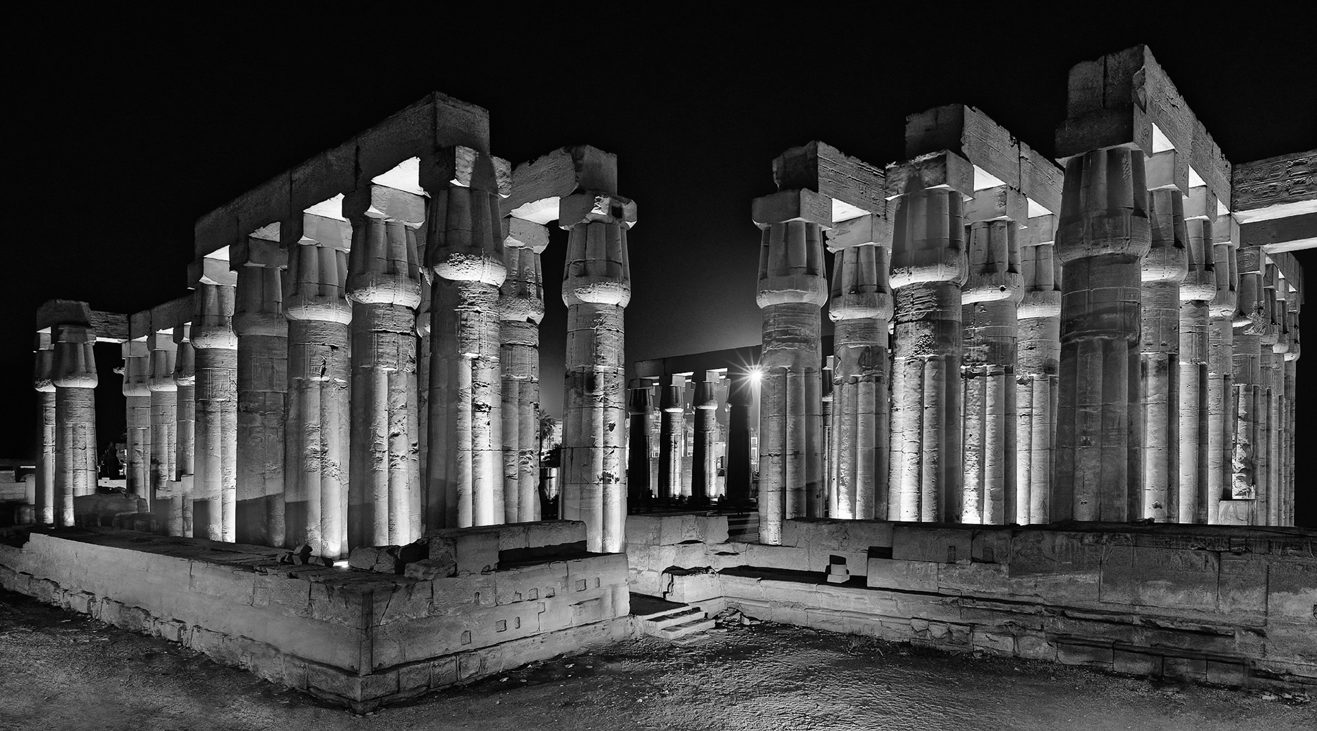 À l'intérieur, le temple déploie une succession de cours péristyles et de colonnades monumentales qui témoignent de la grandeur de la XVIIIe et de la XIXe dynastie. La grande colonnade d'Amenhotep III, avec ses quatorze colonnes aux chapiteaux en forme de papyrus épanoui, crée un axe de lumière et d'ombre saisissant qui mène vers les sanctuaires les plus secrets. Ce site est également unique pour sa continuité historique : au fil des siècles, il a intégré une chapelle dédiée à Alexandre le Grand, des fresques romaines et même la mosquée d'Abou el-Haggag, toujours active, faisant du temple un témoin vivant de plus de 3 000 ans de ferveur religieuse.